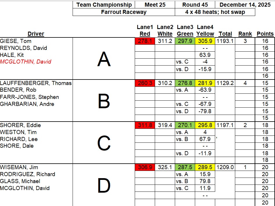 Race Results from Dec 14, 2025 – Team Championship Race – Cartrix 1950’s F1 at Farrout Raceway