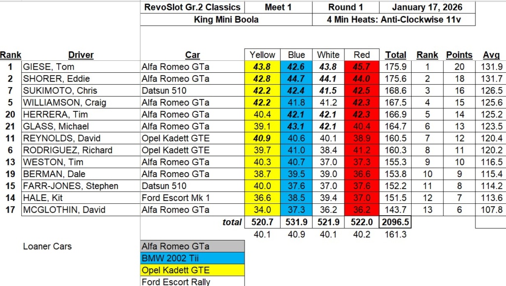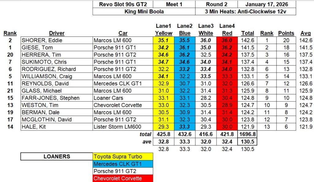 Race Results from January 17, 2025 – RevoSlot Gr. 2 Classics and RevoSlot 90’s GT2 at King Mini Boola Raceway