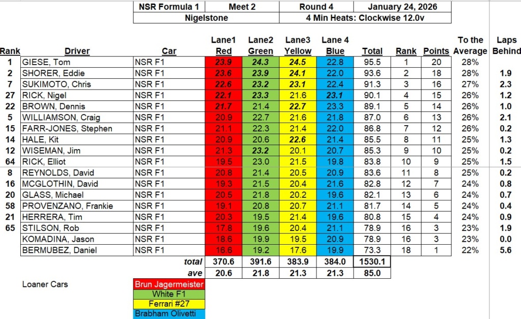Nigel as usual was a gracious host and e had a great day of racing with several people new to Nigel’s 4-Lane Scalextric Sport Nigelstone and 3 new racers. Rob S (2nd time), Elliot, Frankie and Daniel joined us for the first time and all did very well, while Jason did well on his first visit to Nigelstone.