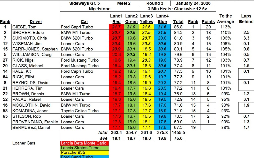 In Sideways 1970s Group 5 we had not 1, not 2 but 3 ties for placings! Kit and Elliot tied for 9th place on 77.3 laps and just 1/10th of lap behind that David R and Tim H tied for 11th meaning e had 4 racers split by 1/10th of a lap after 12 mins of racing! Additionally David M and Jason tied for 15th place. Jim W and SFJ took 4th and 5th and special mention of Elliot who grabbed the aforementioned well deserved 9th as newbie to the club, albeit on his Dads track 🙂